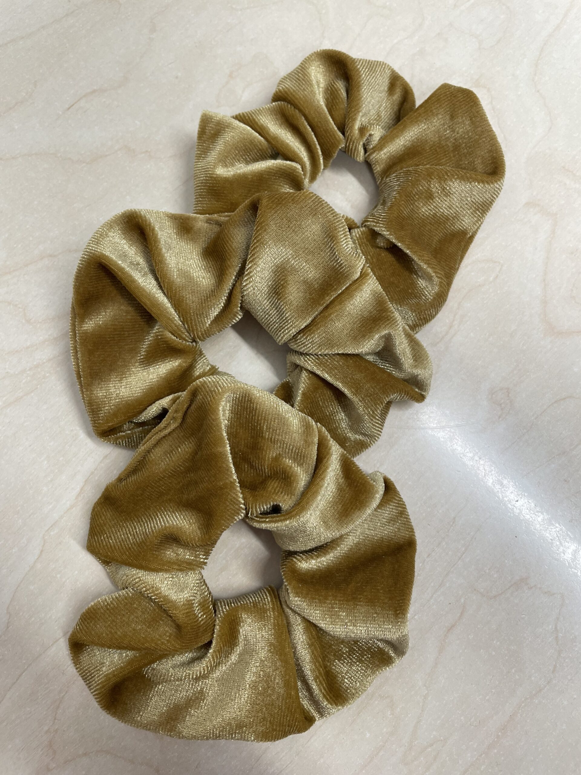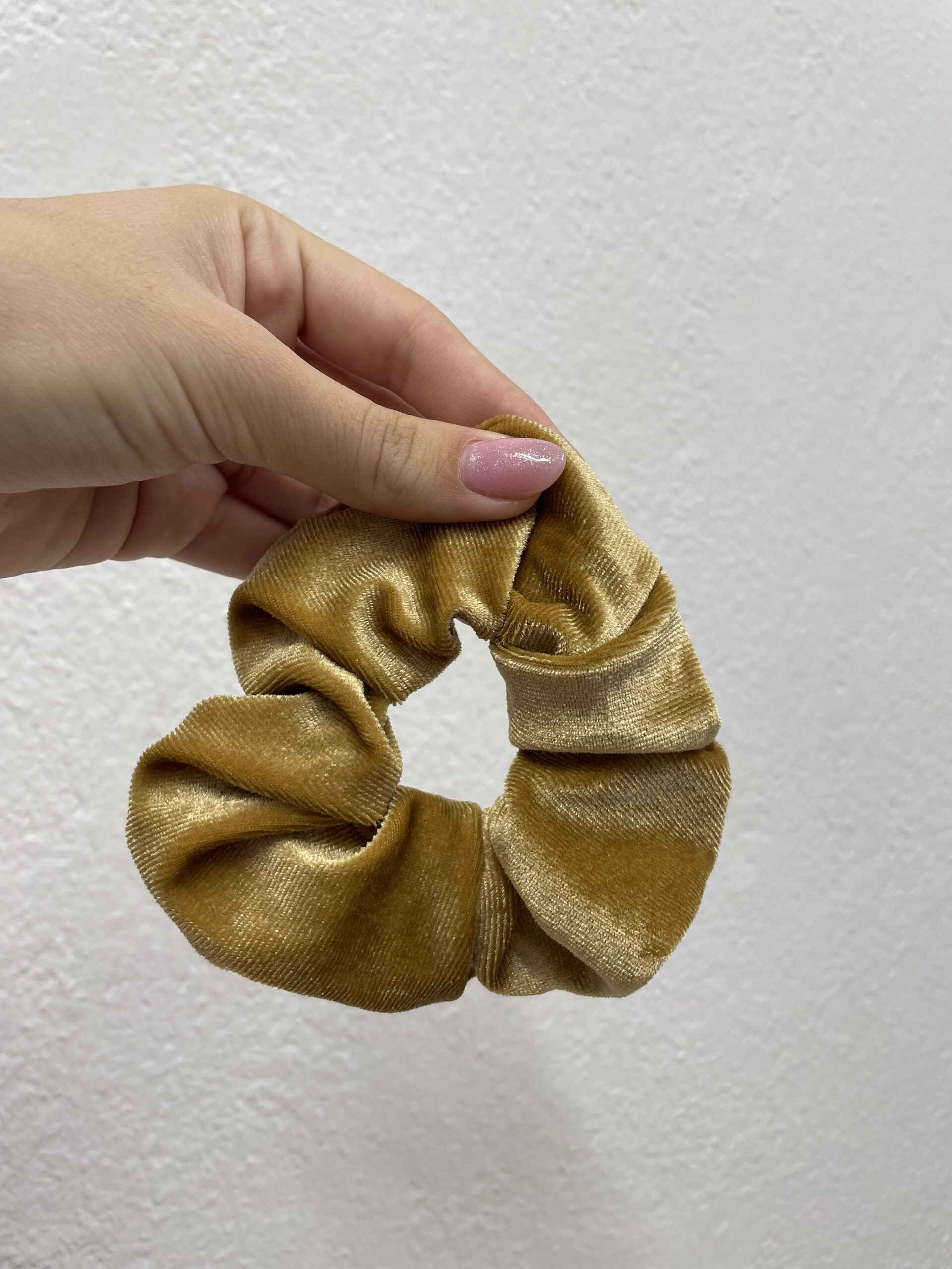 Ένα κομψό μικρού μεγέθους βελούδινο scrunchie σε υπέροχη χρυσαφένια απόχρωση. Η απαλή βελούδινη υφή του προσφέρει άνετο κράτημα χωρίς να ταλαιπωρεί τα μαλλιά, ενώ το διαχρονικό του χρώμα το κάνει ιδανικό για καθημερινές εμφανίσεις αλλά και πιο elegant looks. Ταιριάζει εύκολα σε όλους τους τύπους μαλλιών και προσθέτει μια λεπτή πινελιά πολυτέλειας σε κάθε χτένισμα.