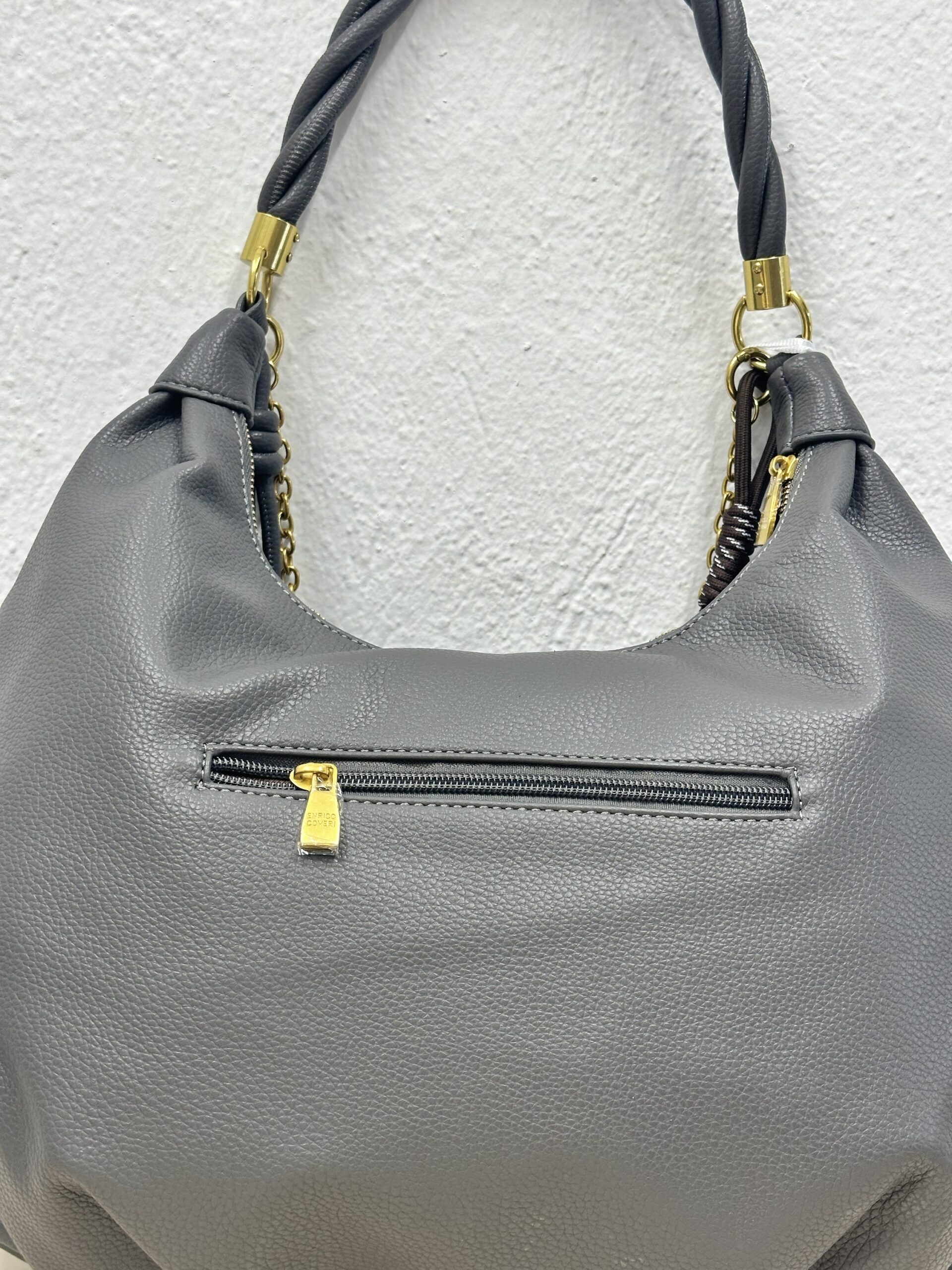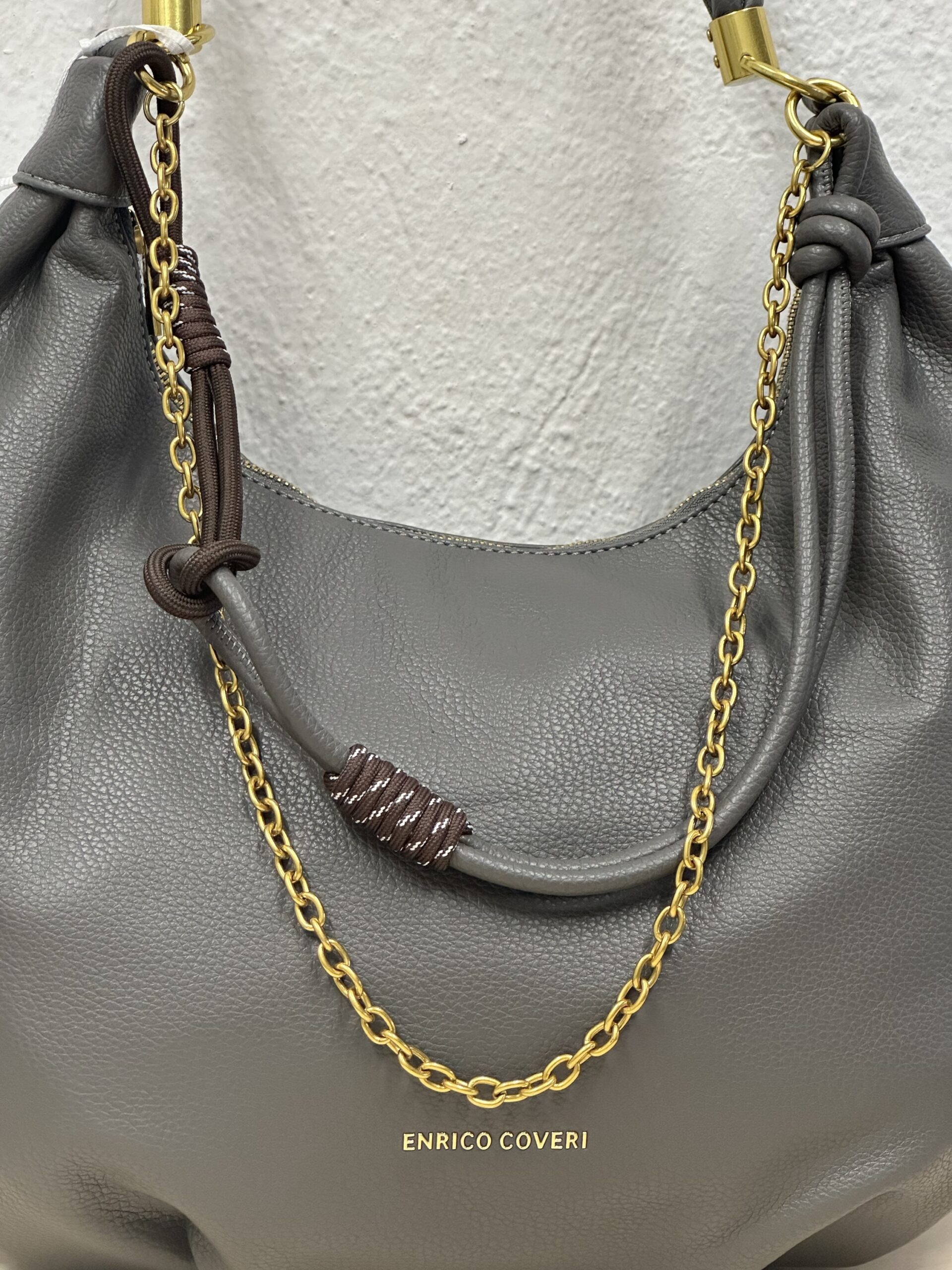 Κομψή γυναικεία τσάντα ώμου Enrico Coveri σε σκούρο γκρι, από ανθεκτικό συνθετικό δέρμα. Διαθέτει στριφτή χειρολαβή και διακοσμητική χρυσή αλυσίδα – ιδανική για καθημερινές εμφανίσεις με στυλ.