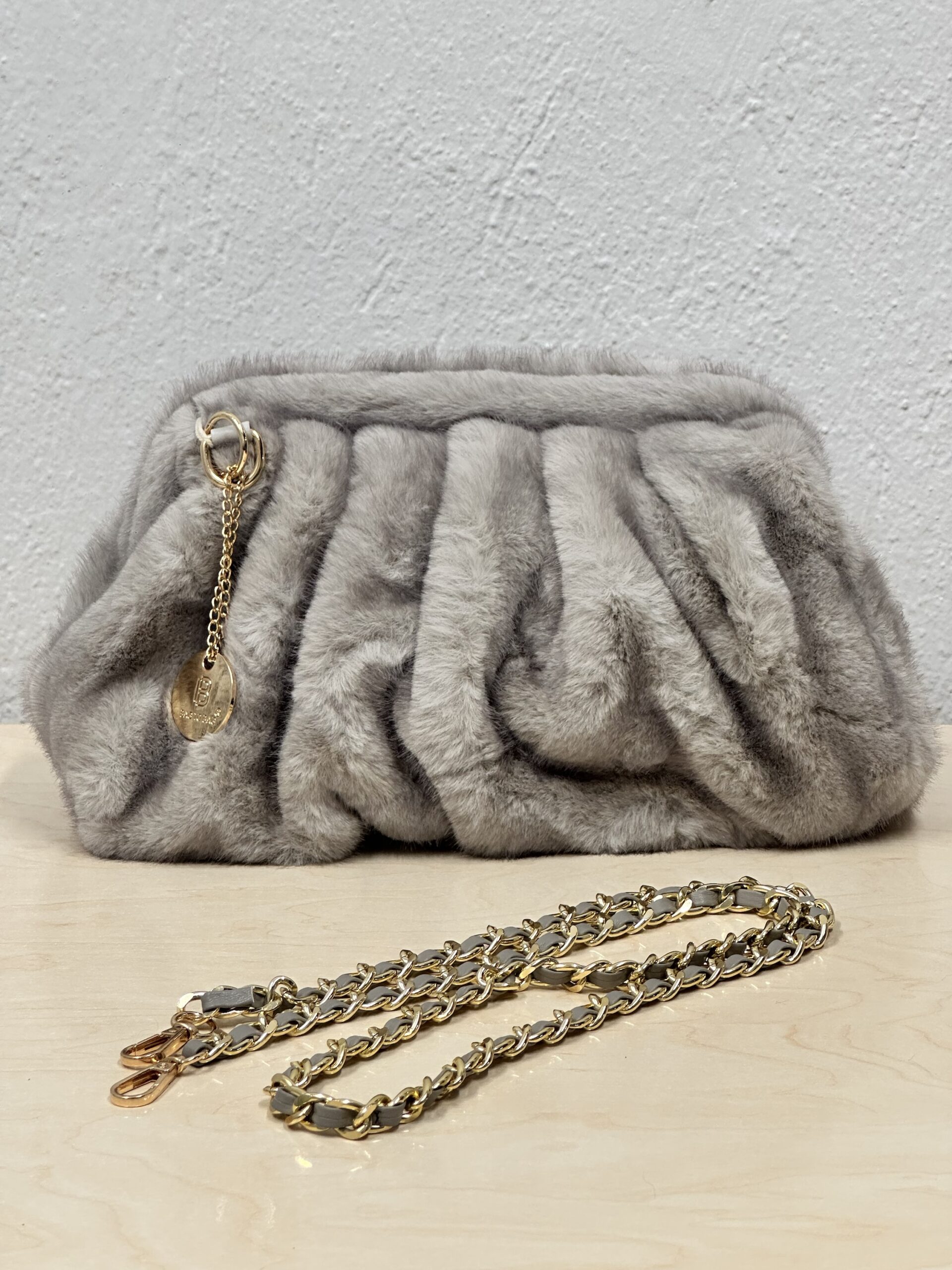 Αναβάθμισε τις βραδινές και καθημερινές σου εμφανίσεις με αυτή τη μοναδική plush τσάντα σε κομψό γκρι χρώμα. Η απαλή γούνινη υφή της προσφέρει μια πολυτελή και trendy αισθητική, ενώ οι πτυχώσεις της δημιουργούν ένα ιδιαίτερο, elegant αποτέλεσμα που τραβά τα βλέμματα.