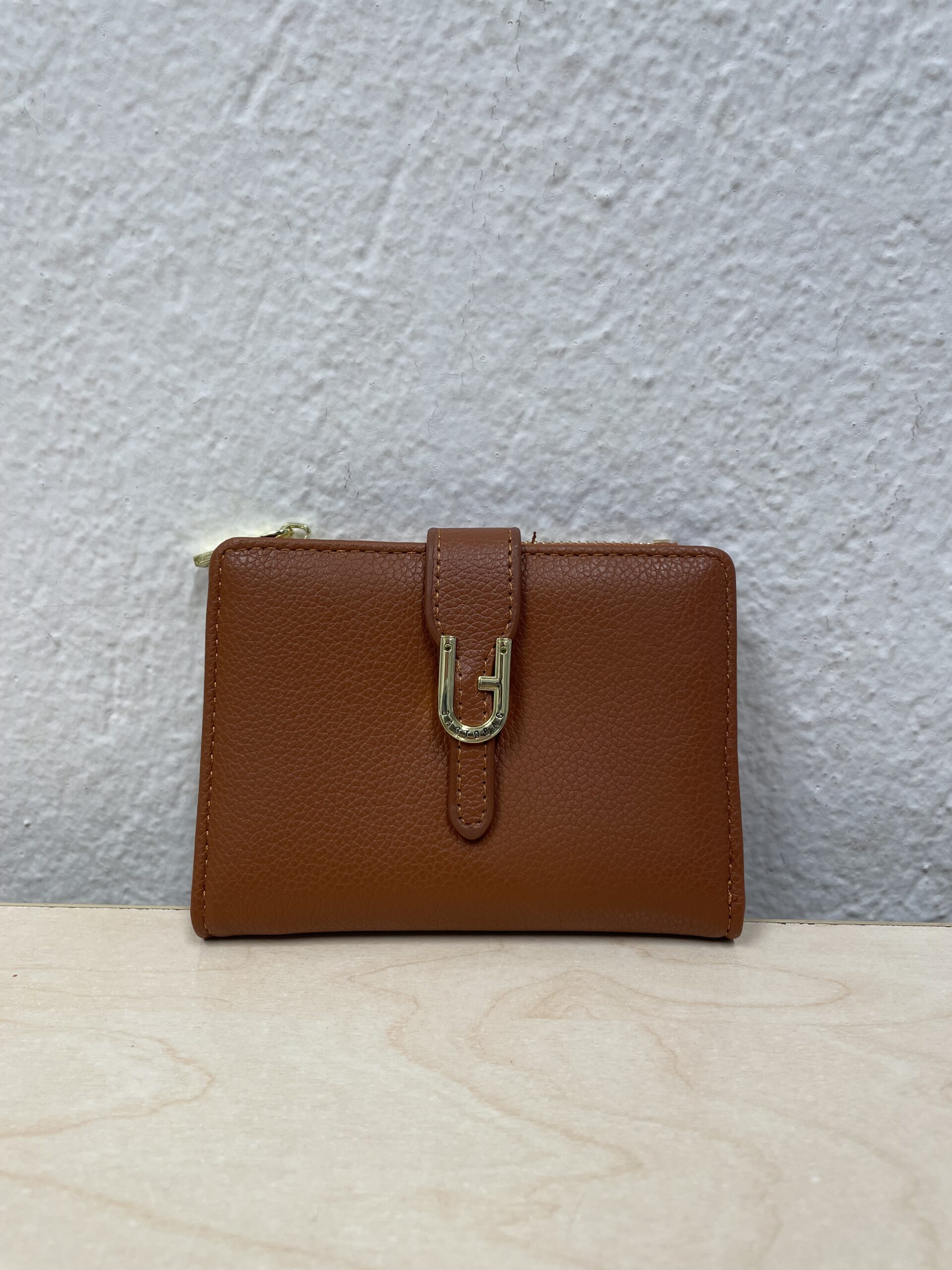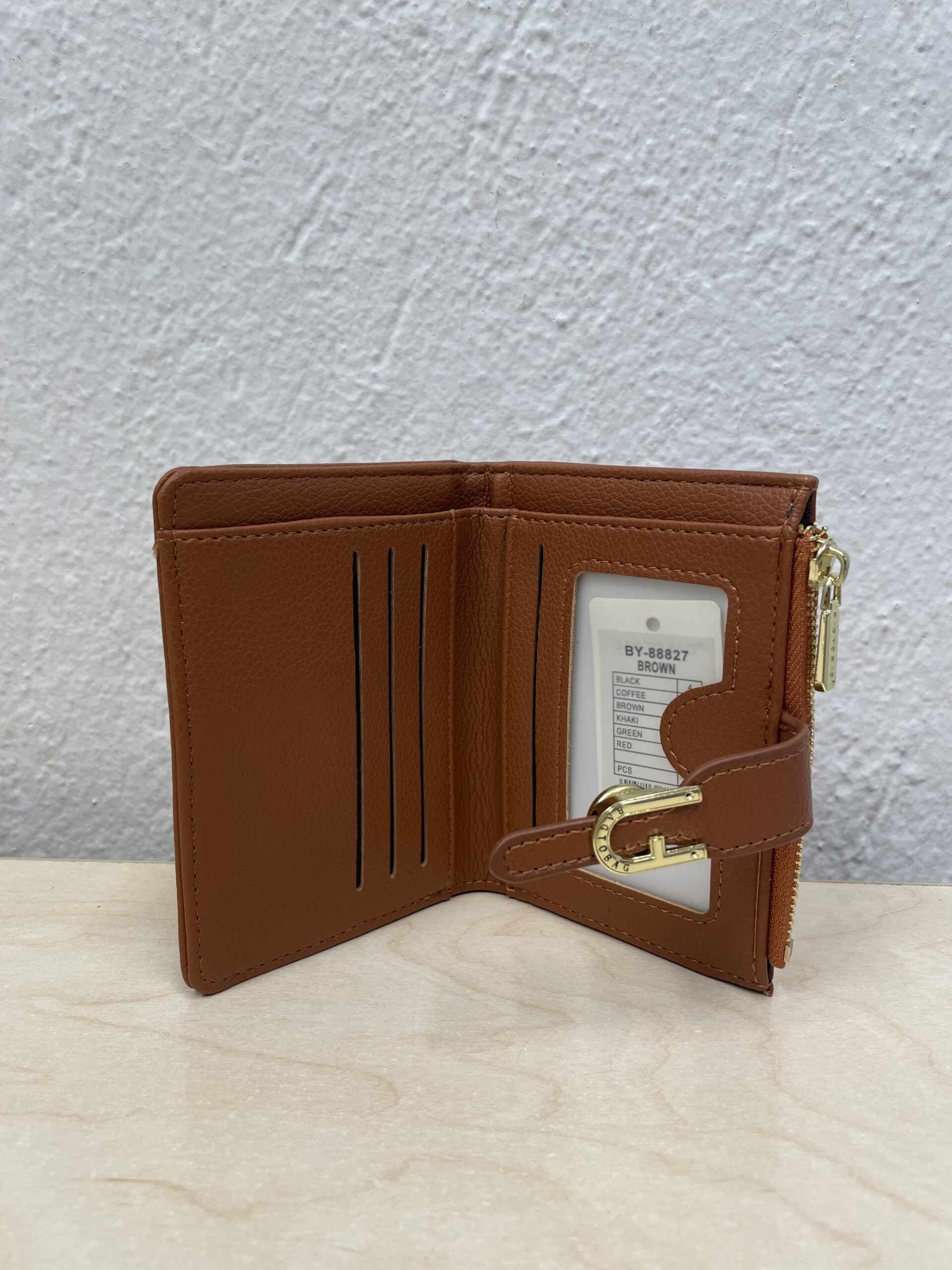 Κομψό καφέ πορτοφόλι με μεταλλικό κούμπωμα, θήκες για κάρτες και φερμουάρ για κέρματα. Ιδανικό για καθημερινή χρήση.