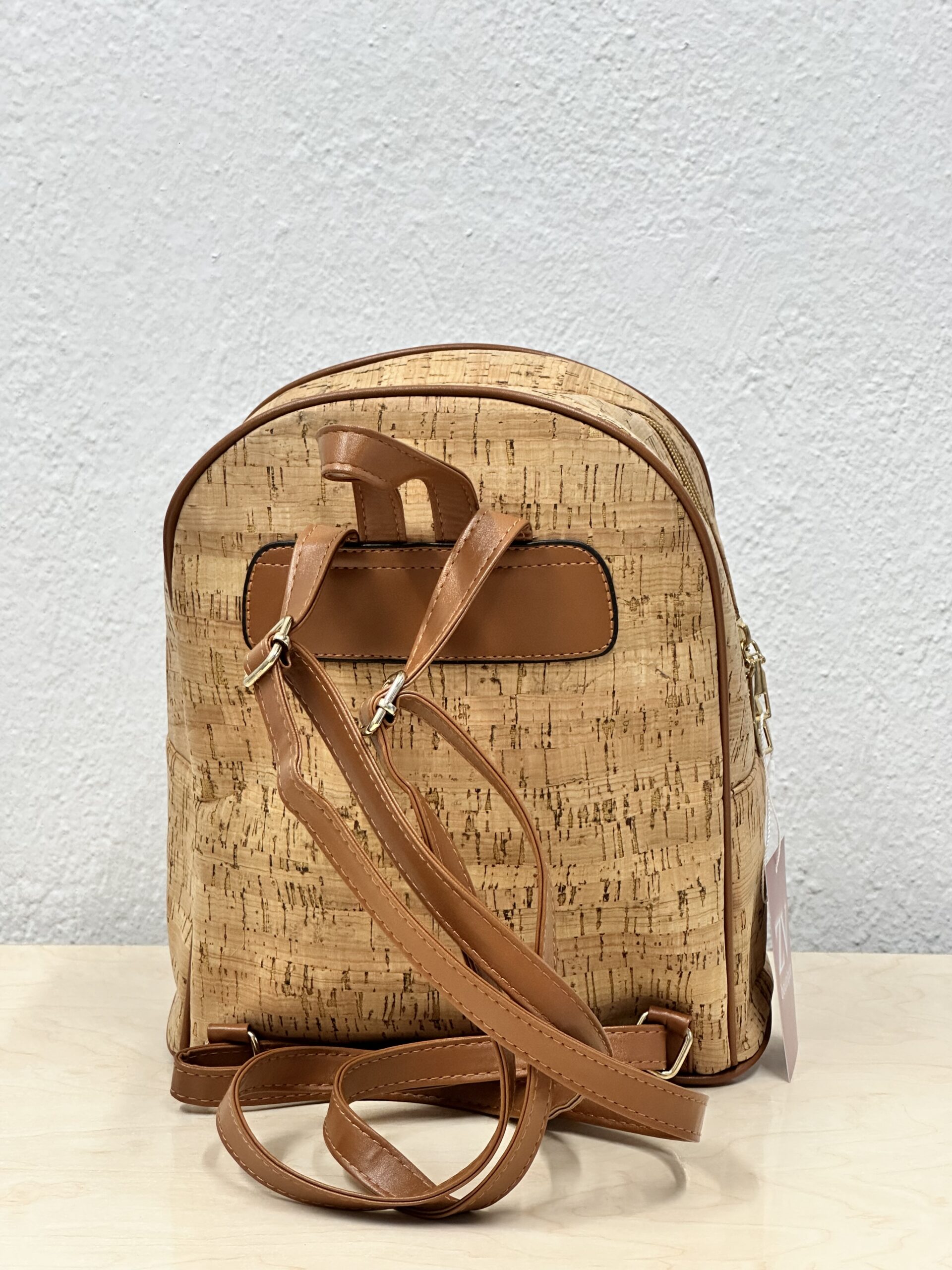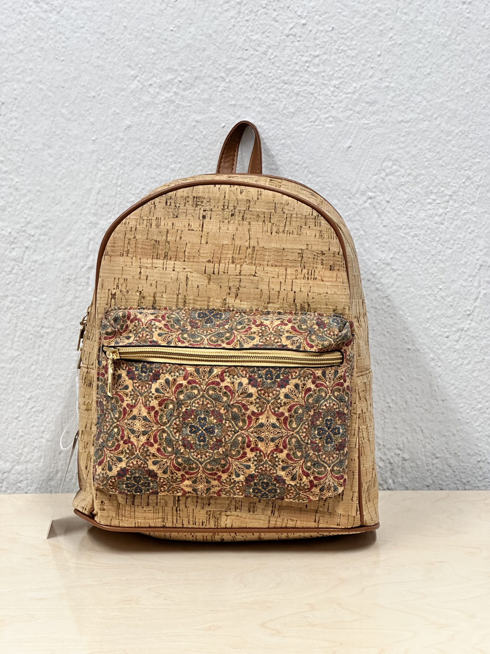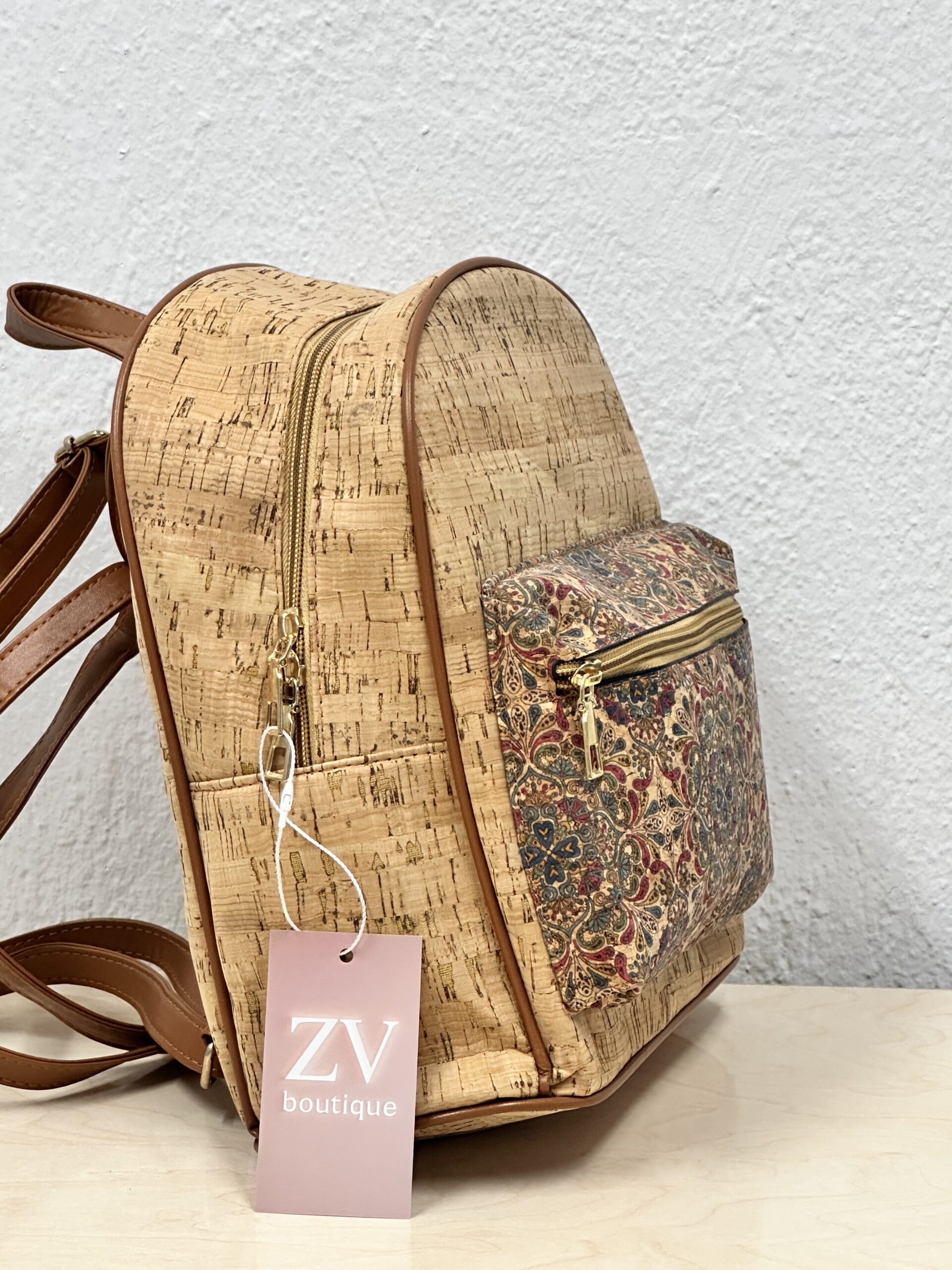 Ένα κομψό και οικολογικό σακίδιο πλάτης κατασκευασμένο από φυσικό φελλό, ιδανικό για όσους αγαπούν τη μόδα με περιβαλλοντική συνείδηση. Διαθέτει μπροστινή τσέπη με φερμουάρ και υφασμάτινη λεπτομέρεια με καλλιτεχνικό, έθνικ μοτίβο που προσθέτει χαρακτήρα. Ελαφρύ, άνετο και ανθεκτικό, με ρυθμιζόμενους ιμάντες και μεταλλικές λεπτομέρειες σε χρυσό χρώμα.