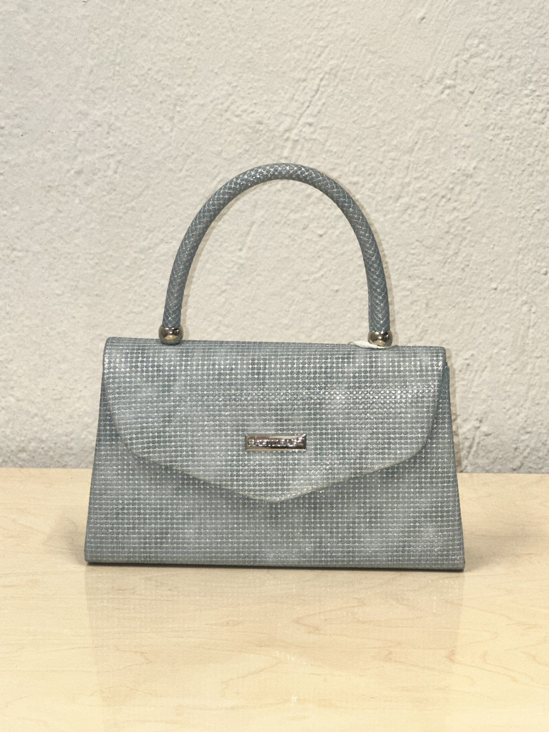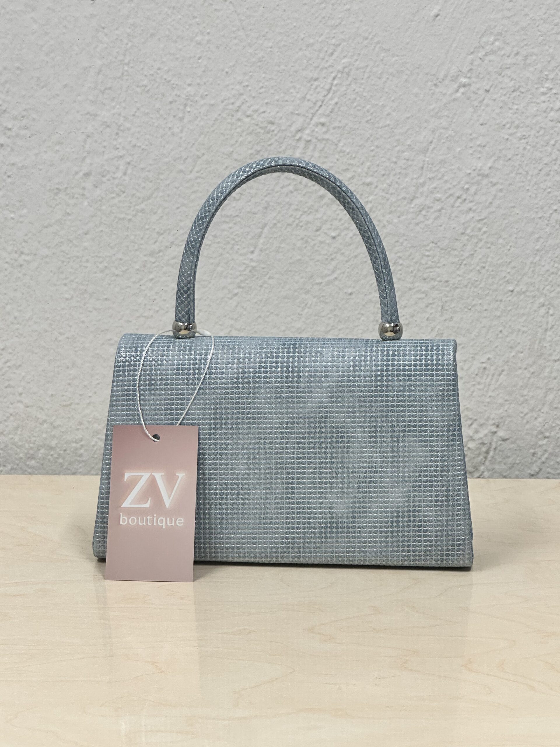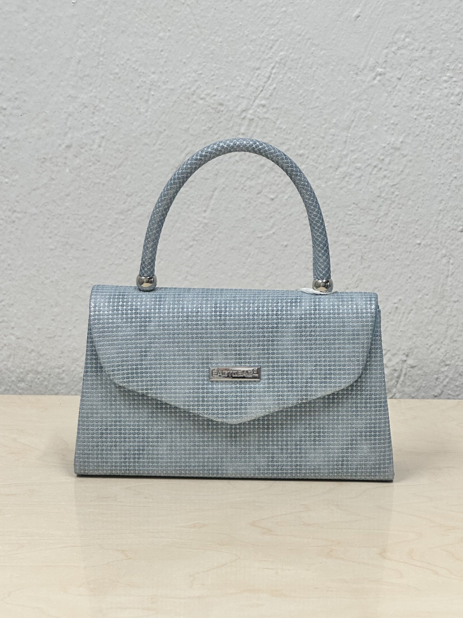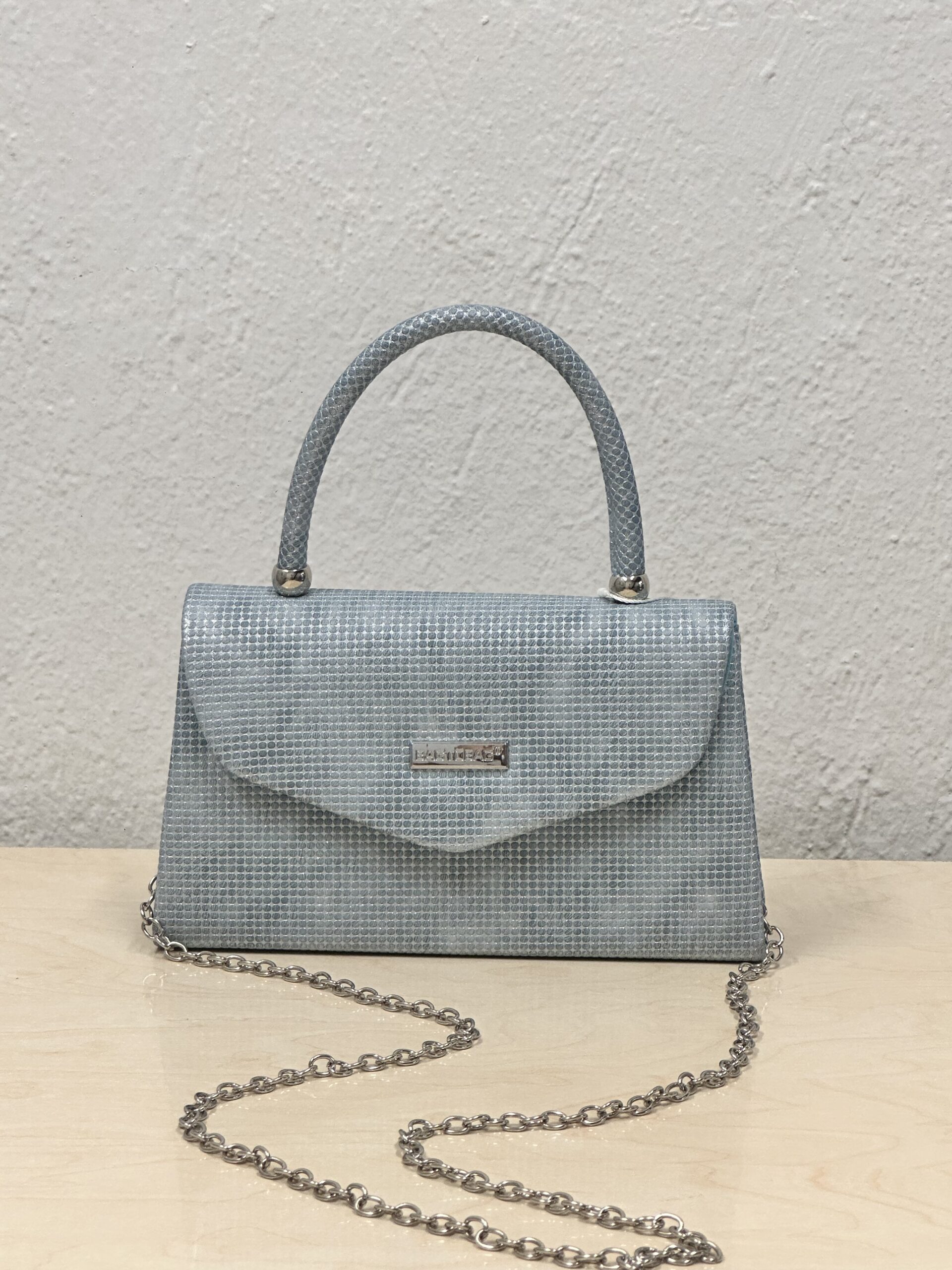 Αυτή η εκλεπτυσμένη τσάντα χειρός σε γαλάζια απόχρωση, με μοναδικό σχέδιο και μεταλλική αλυσίδα, θα προσδώσει μία αίσθηση φινέτσας και κομψότητας σε κάθε εμφάνιση. Η γαλάζια υφή της τσάντας προσφέρει μία φρέσκια και ανανεωμένη αίσθηση, ενώ το μεταλλικό λογότυπο στο μπροστινό μέρος προσδίδει έναν αέρα πολυτέλειας.