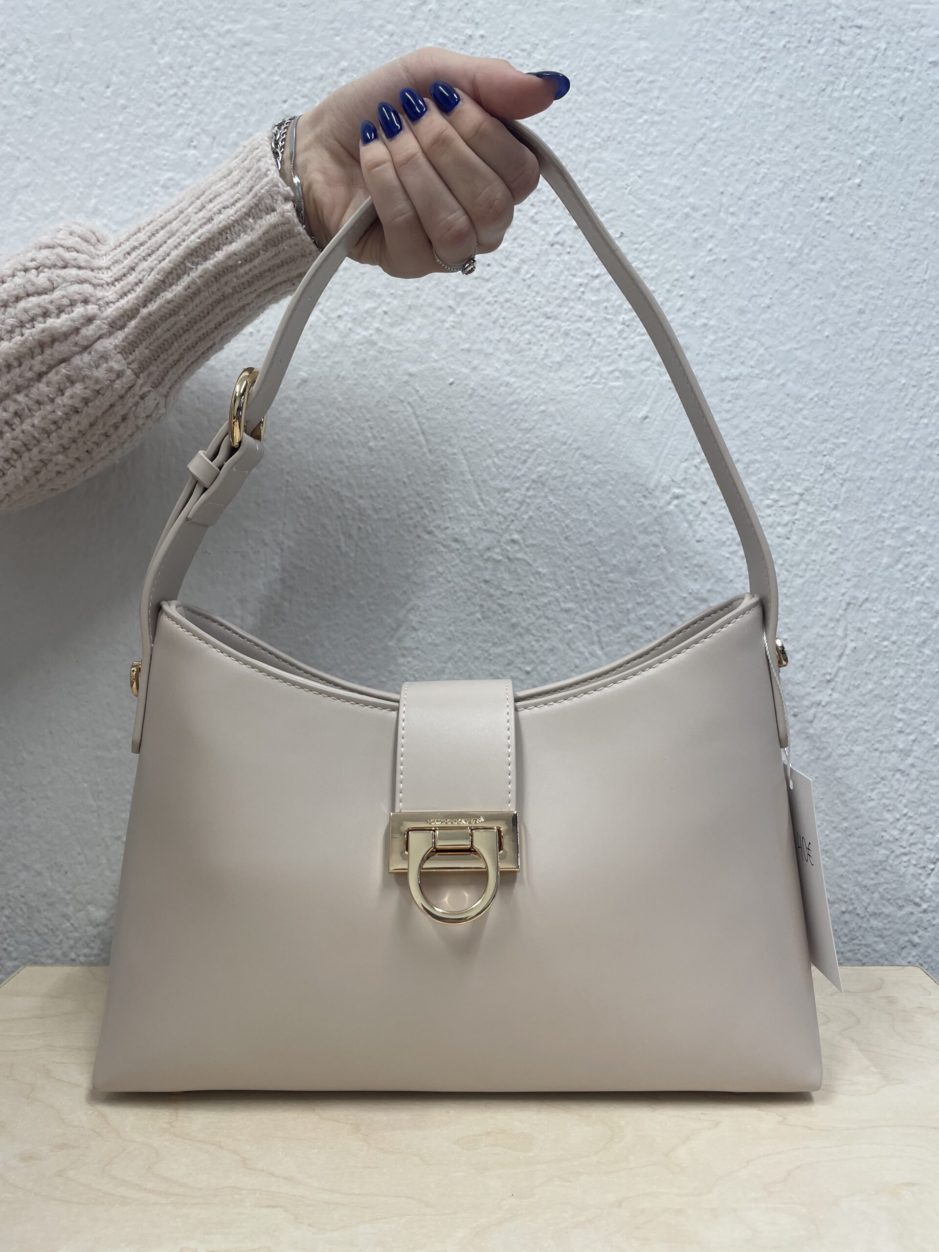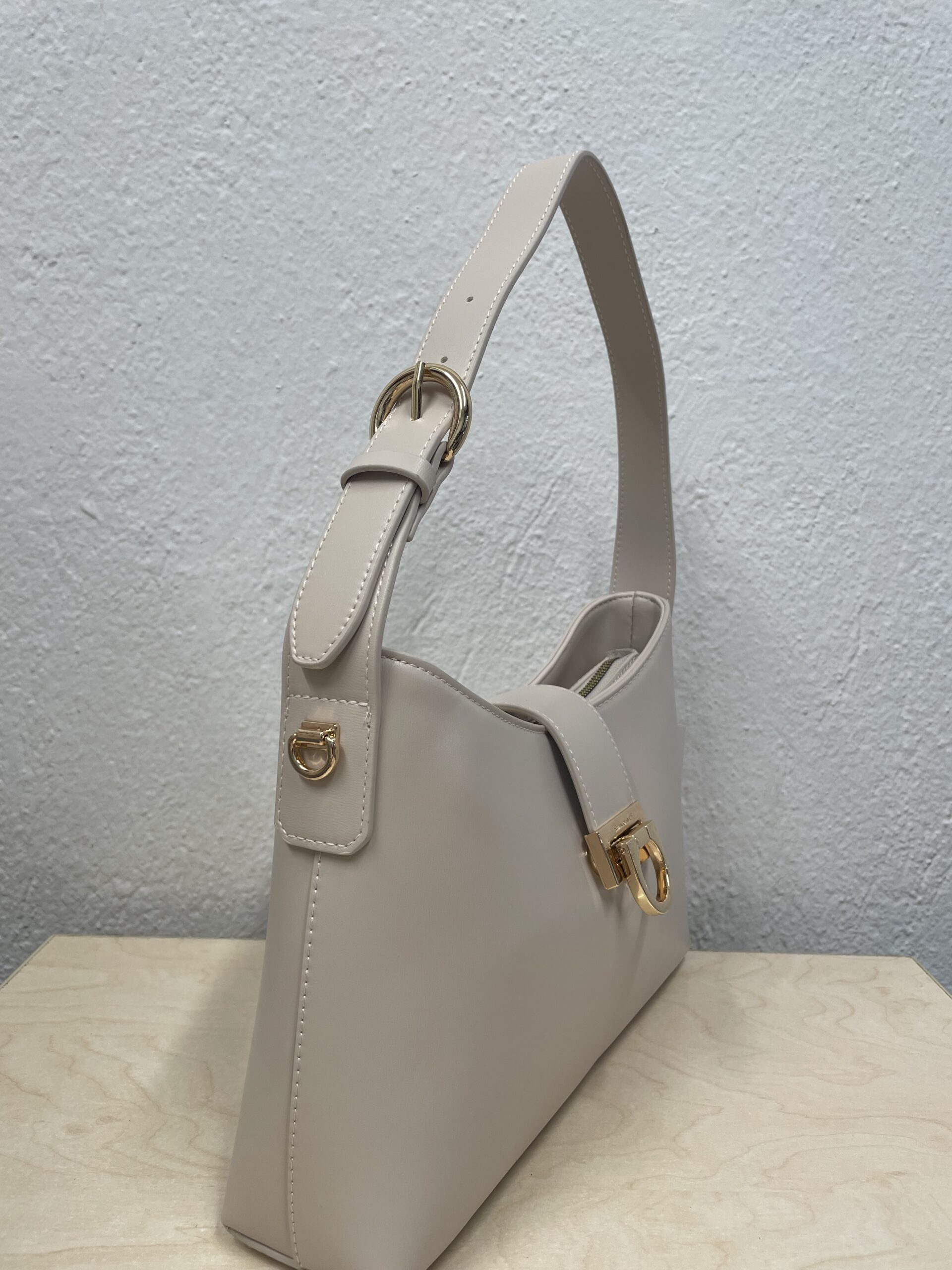 Μία κομψή και διαχρονική τσάντα που συνδυάζει minimal αισθητική με λειτουργικότητα. Η ιβουάρ απόχρωση και οι χρυσές μεταλλικές λεπτομέρειες την κάνουν να ξεχωρίζει, προσθέτοντας μια refined, πολυτελή πινελιά σε κάθε εμφάνιση.