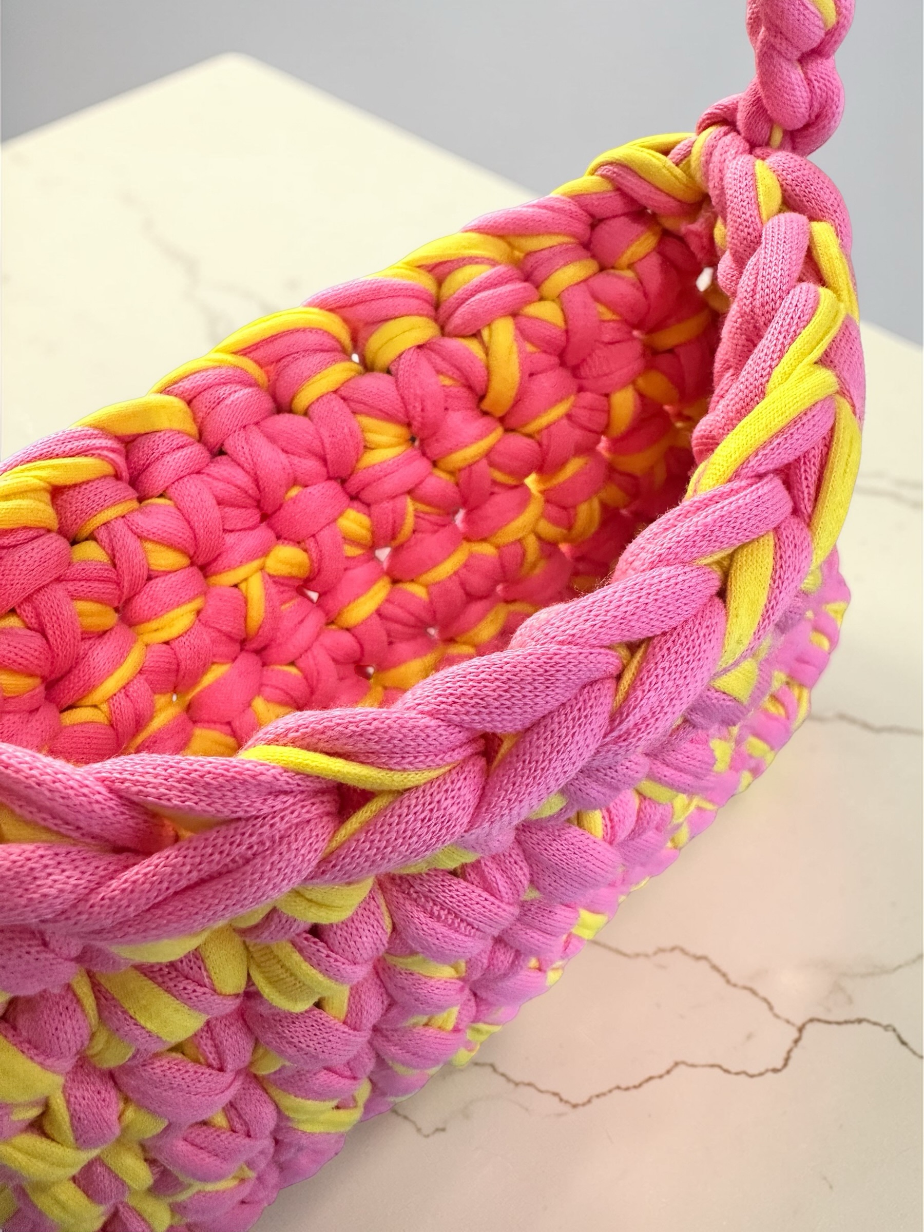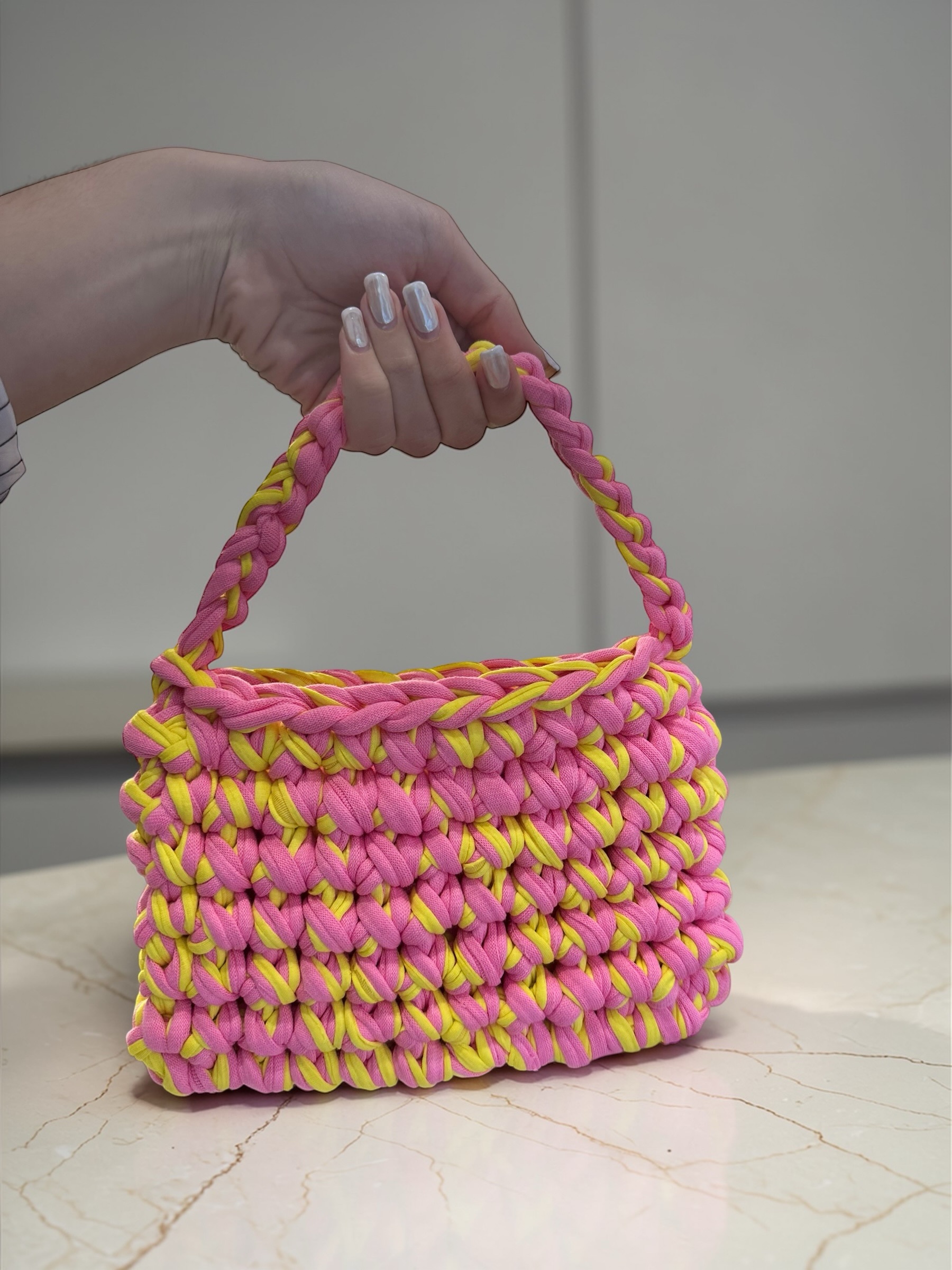 Κατασκευασμένη εξ ολοκλήρου στο χέρι από premium T-shirt νήμα, κάθε τσάντα είναι μοναδική και φέρει τον ιδιαίτερο χαρακτήρα της χειροποίητης δημιουργίας.